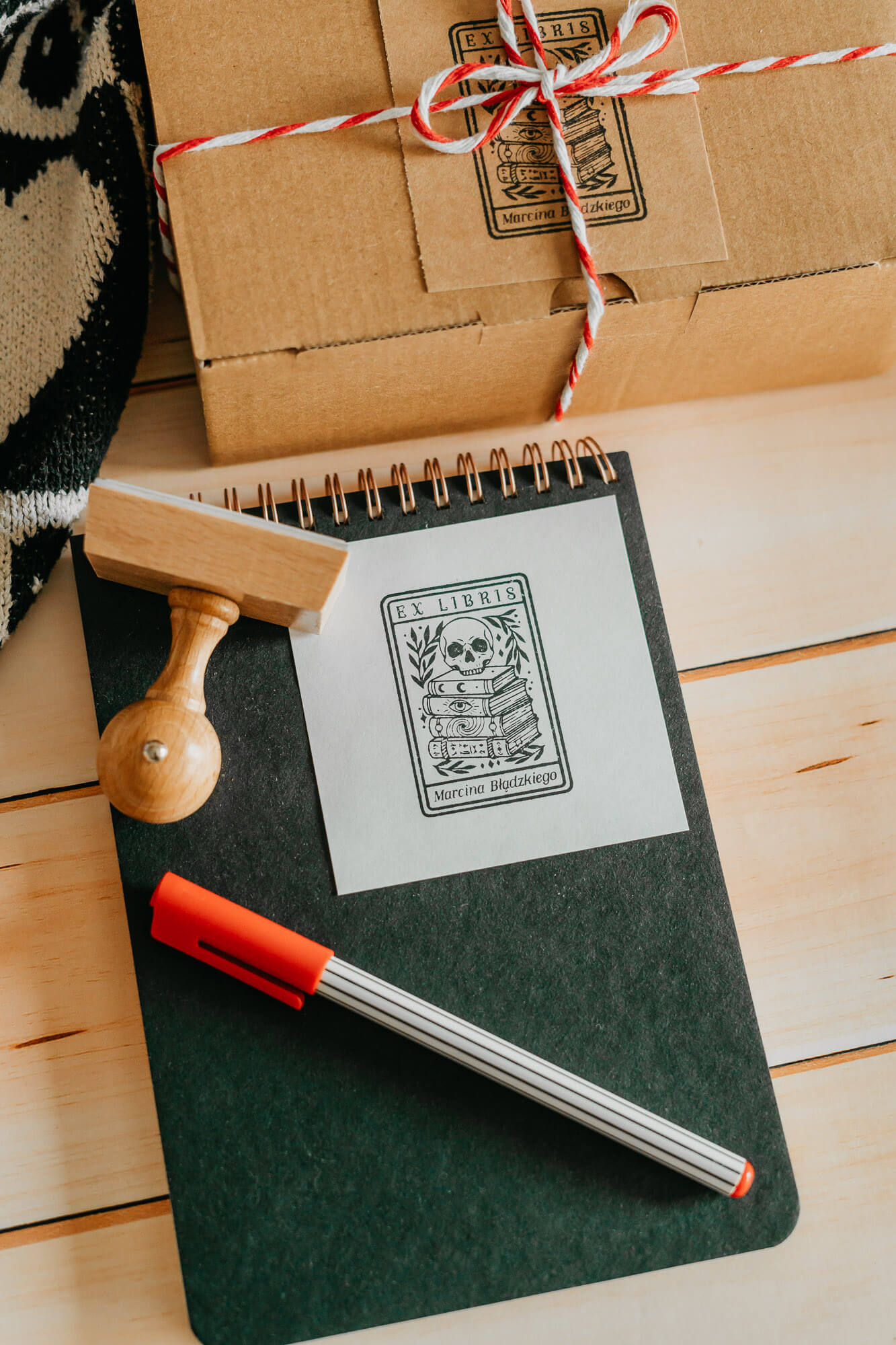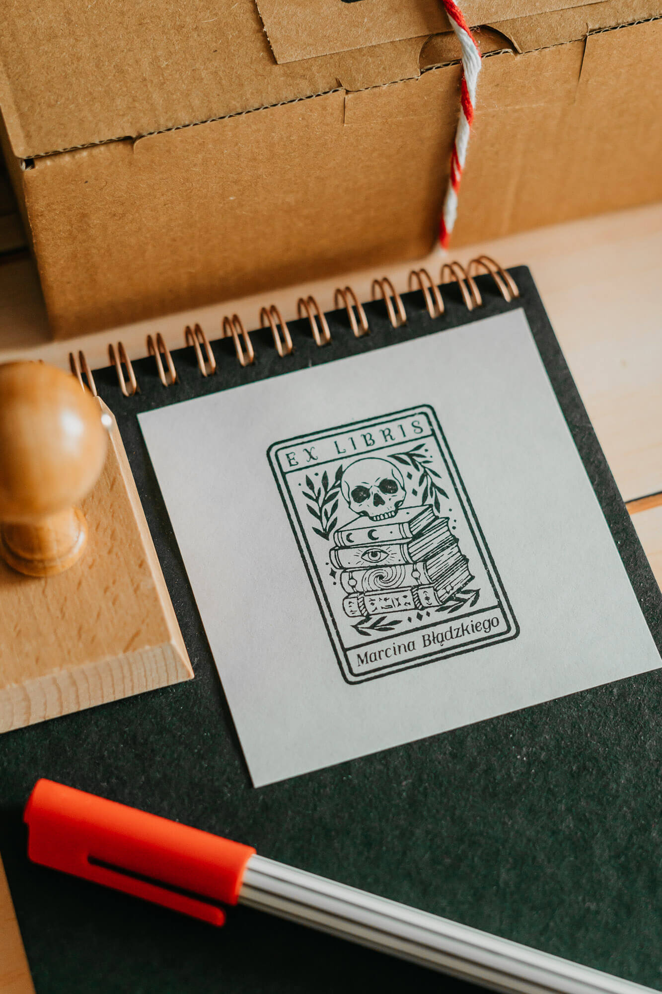 Drewniana pieczątka Ex Libris „Czaszka i książki”, 60x40mm